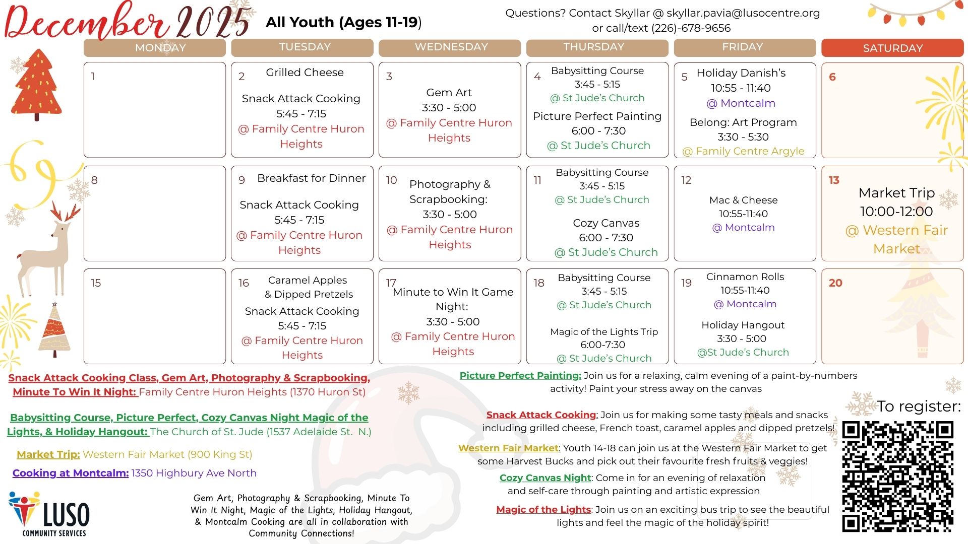 For more information about current programming, contact Skyllar Pavia, Youth Worker via email: youth [at] lusocentre.org (youth[at]lusocentre[dot]org) OR via telephone: 519-452-1466 (office), 226-678-9656 (cell).