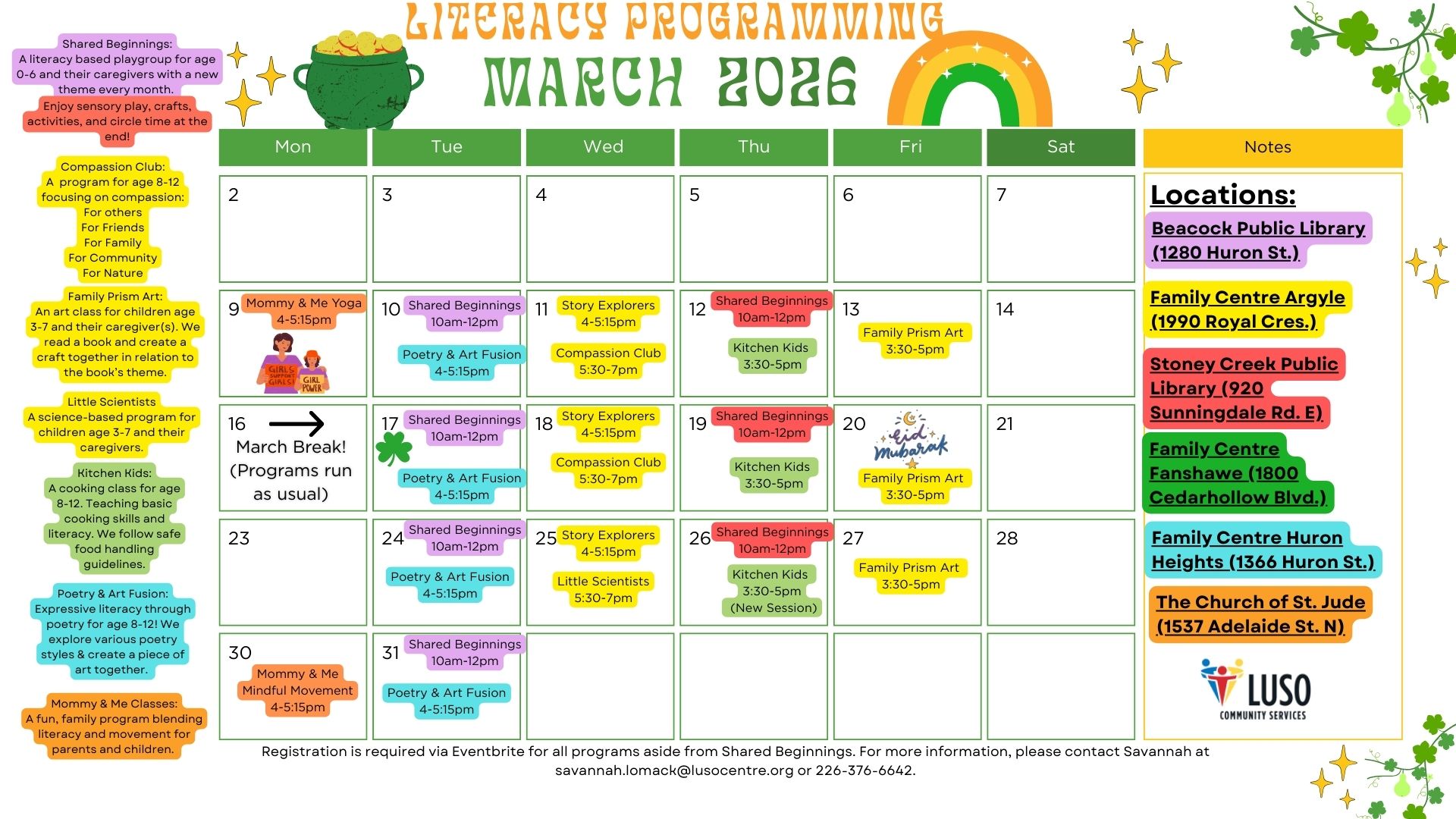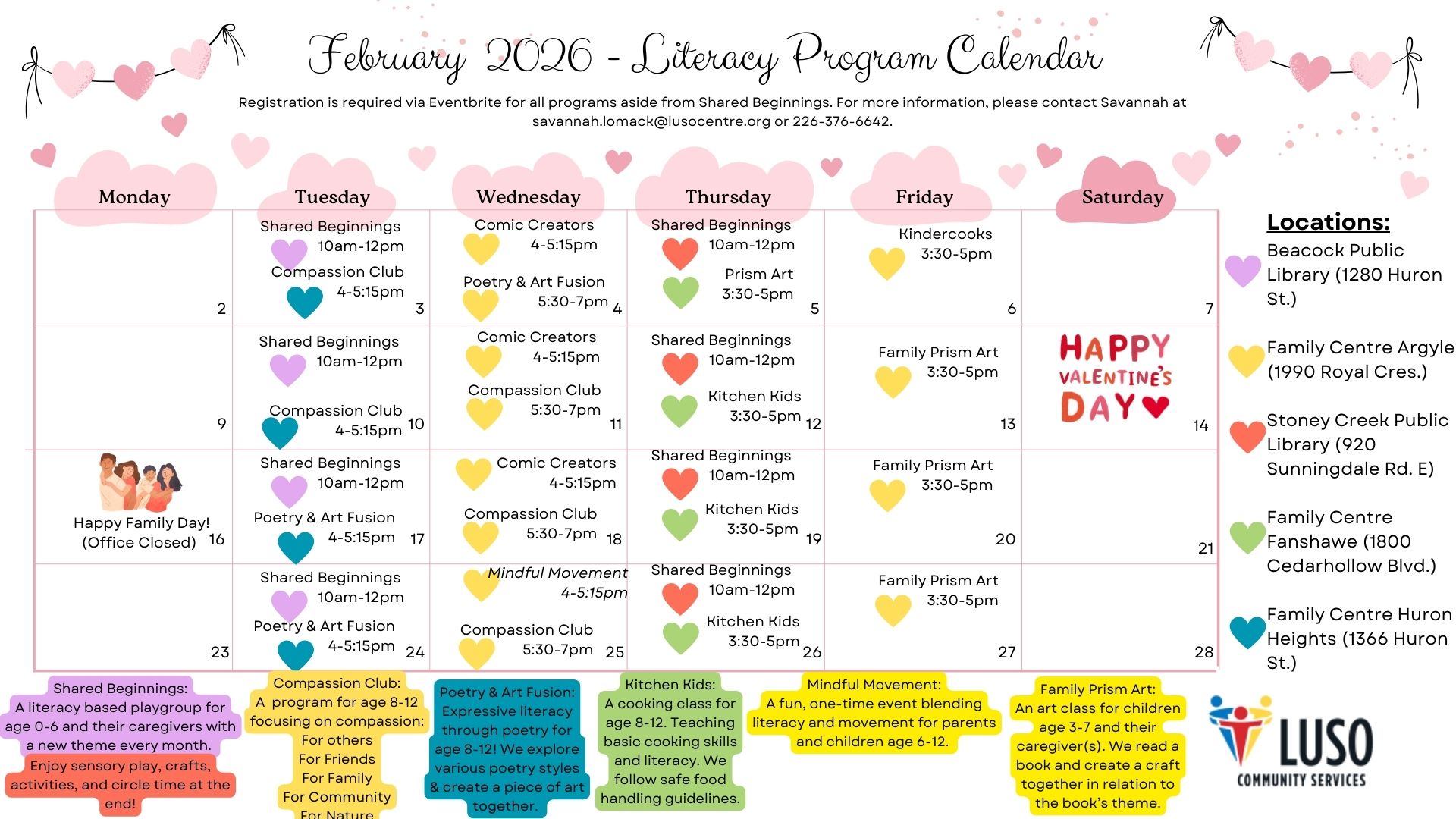 For more information about our current programming, contact Savannah Lomack, Literacy Coordinator via email: literacy [at] lusocentre.org (literacy[at]lusocentre[dot]org) OR via telephone: 519-452-1466 (office); 226-376-6642 ( cell-phone)