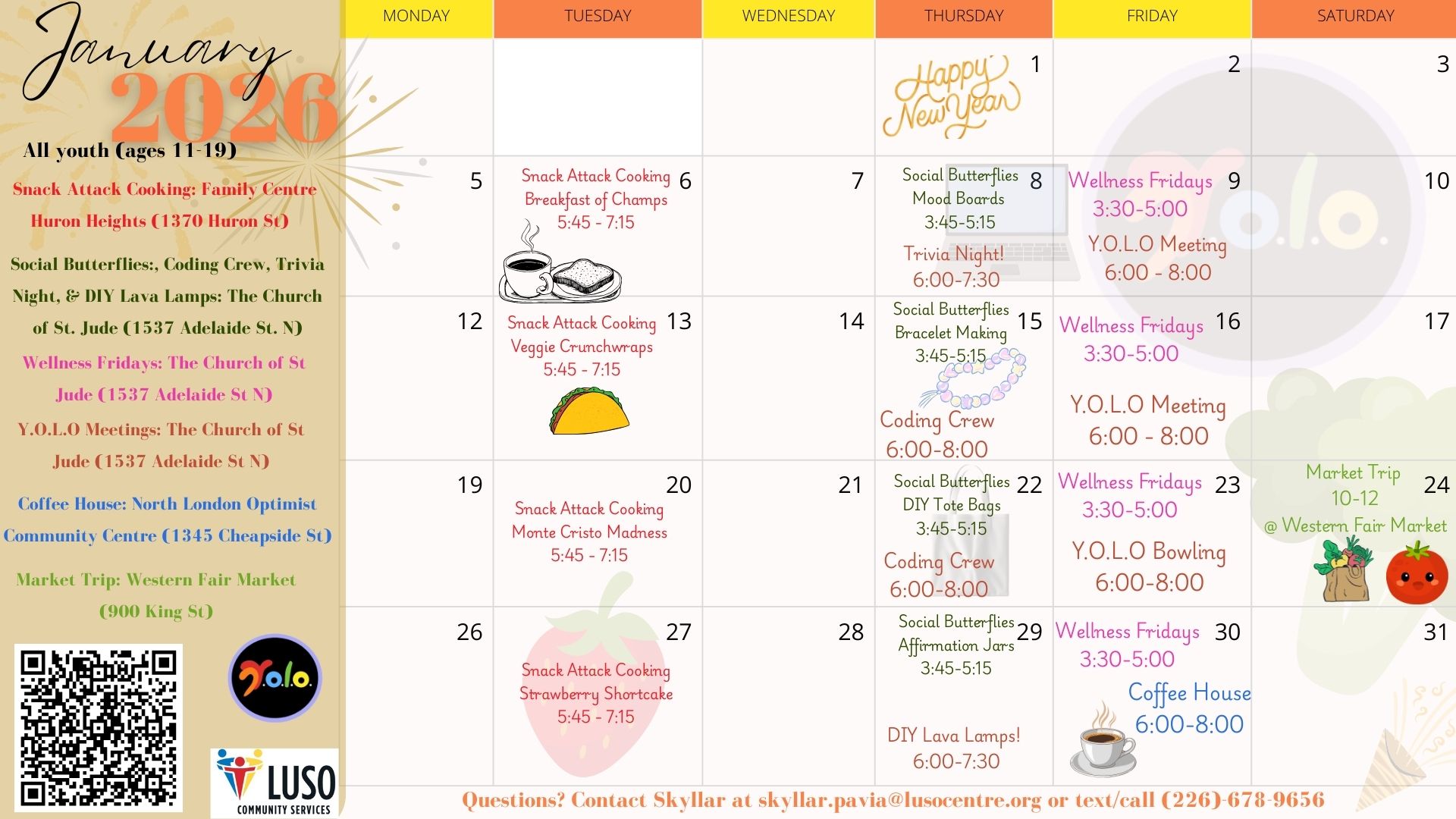 For more information about current programming, contact Skyllar Pavia, Youth Worker via email: youth [at] lusocentre.org (youth[at]lusocentre[dot]org) OR via telephone: 519-452-1466 (office), 226-678-9656 (cell).