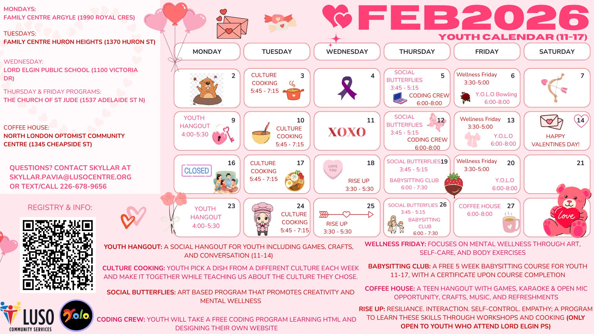 For more information about current programming, contact Skyllar Pavia, Youth Worker via email: youth [at] lusocentre.org (youth[at]lusocentre[dot]org) OR via telephone: 519-452-1466 (office), 226-678-9656 (cell).